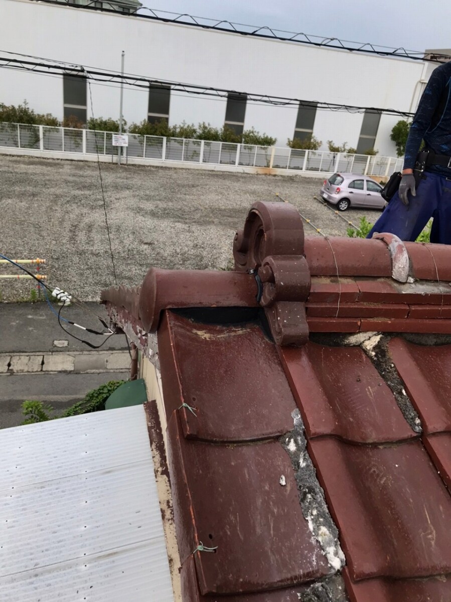 経年劣化により瓦棟部が壊れていました。 瓦屋根でもメンテナンスは必要です 下地の補修を行い 新しく棟を補修しました。
