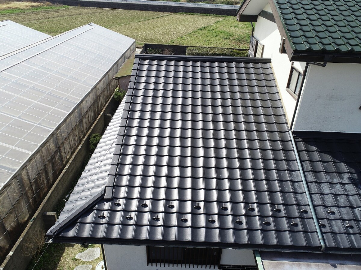 経年劣化により瓦の脱落などが発生 既存瓦を剥がし、ROOGA雅で葺き替えを行いました 屋根材のROOGAについてはこちらを参考にしてみてください。