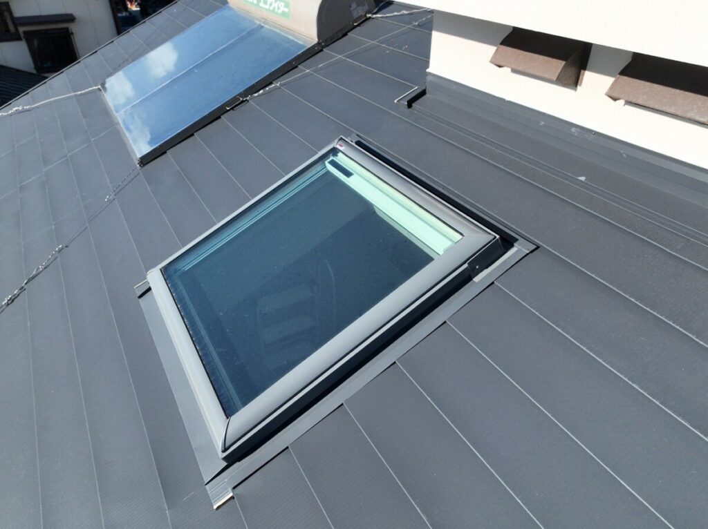 今回は、雨仕舞を確実にするため、天窓のある屋根面の葺き替えと同時に交換を実施しています。