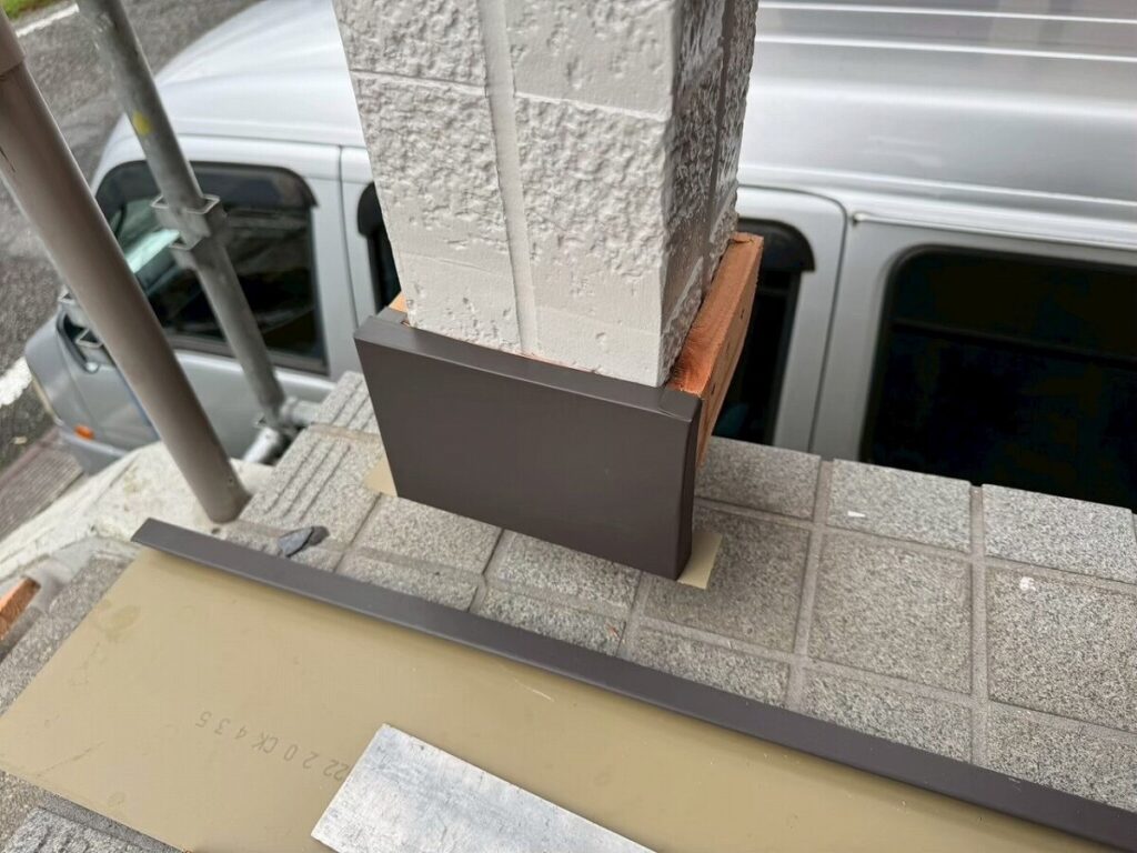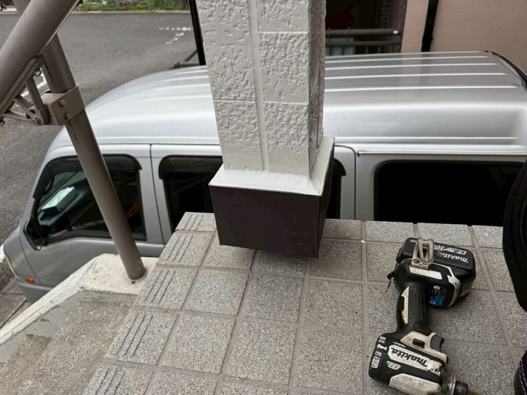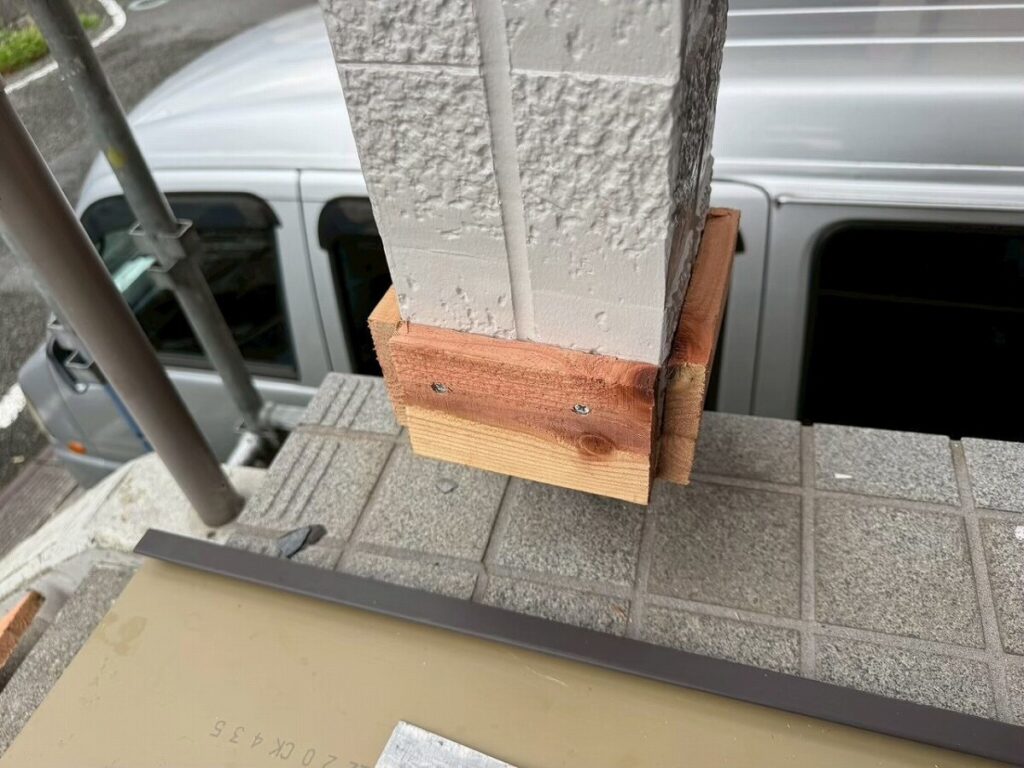 板金職人と打ち合わせた際に、雨が当たらないように板金を巻く方法でまとまり、お施主様もご納得いただ組事が出来たため、板金にて納める形で施工を行いました。