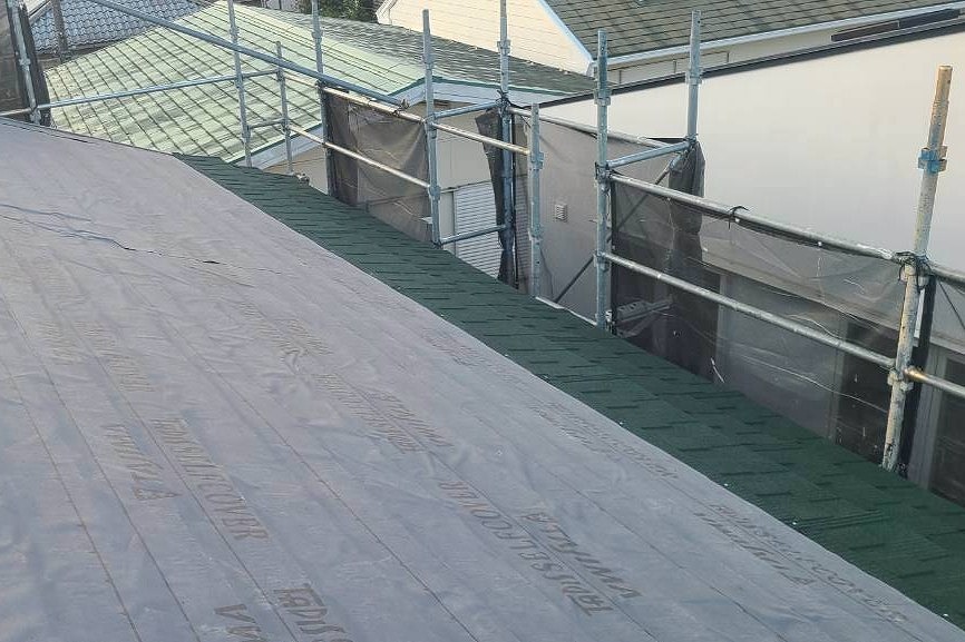 野地面に屋根材を留めた後、上部の屋根材を被せることで、雨水が直接かかるのを防ぎます。